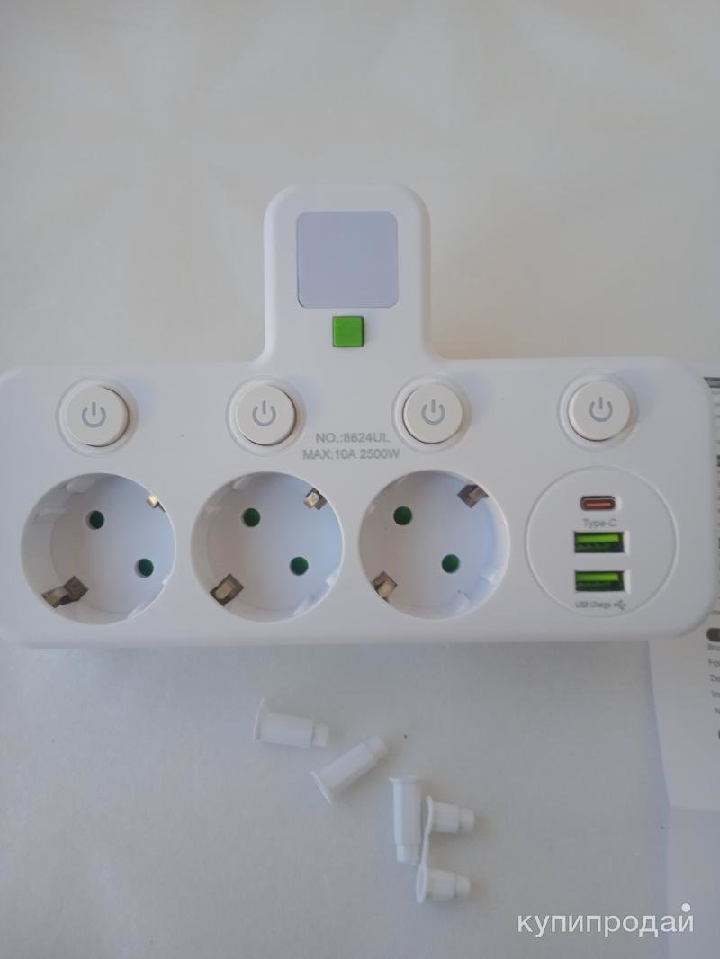 Продам новую розетку накладную четырехместную открытой установки с заземлением, с подсветкой 5Вт, 2 стандартных и type C USB разъёмами.