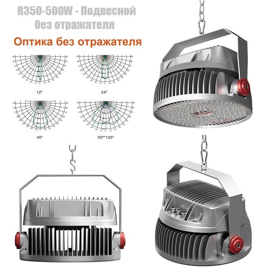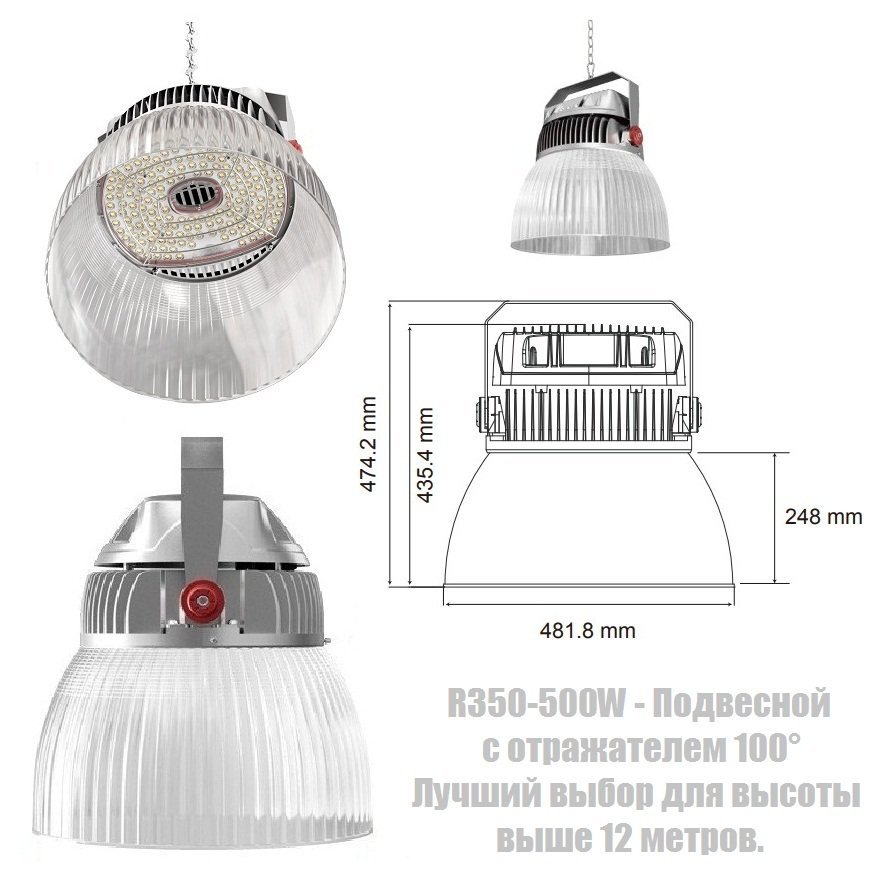 Светодиодный промышленный подвесной светильник R350-500W мощностью 500 Вт, выполняет функцию замены подвесных светильников с металлогалогенными лампами мощностью до 1000 Вт. При этом экономия электроэнергии достигает 50%, срок службы возрастает более чем в 3 раза. Помимо общих преимуществ светодиодных светильников [мгновенное включение, низкие пульсации светового потока, отсутствие ртути, возможность диммирования, устойчивость к перепадам напряжения], благодаря особенностям конструкции светильник R350 тип подвесной отличает высокая прочность, удобство монтажа и обслуживания.
