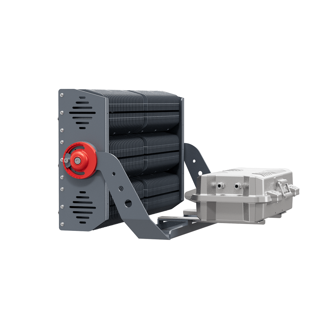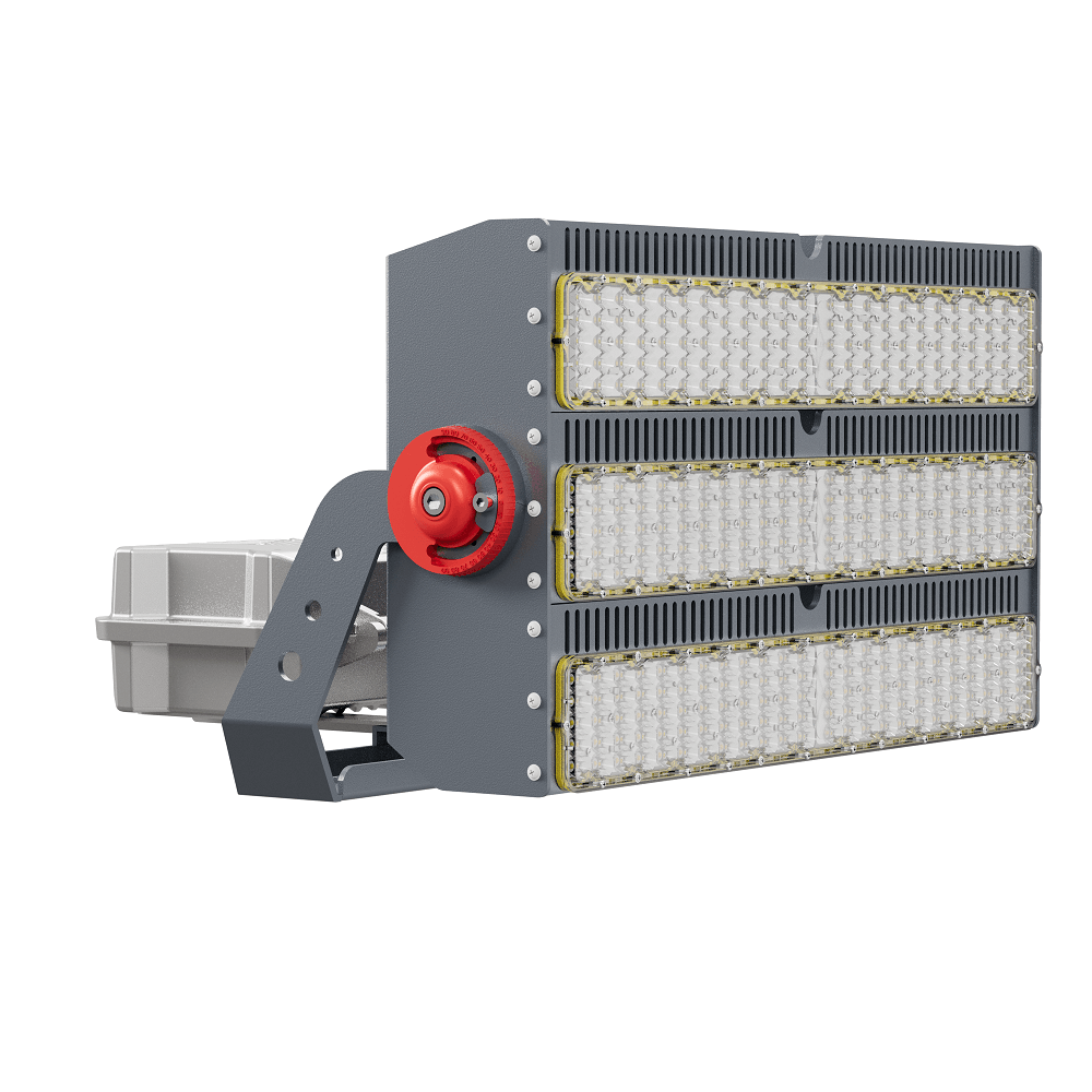 Трехмодульный светодиодный прожектор D680-1850W-UN представляет собой многоцелевой модульный осветительный прибор мощностью 1850 Вт в алюминиевом корпусе. Устанавливается на любую ровную поверхность с помощью поворотного кронштейна, применяется как для внутреннего, так и для наружного освещения. Основное применение прожектора в составе высоко мачтовых осветительных установок.