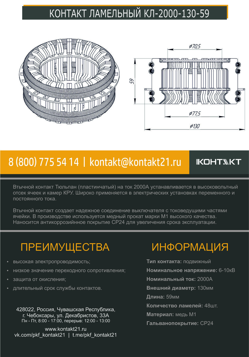 Втычной контакт Тюльпан (пластинчатый) на ток 2000А устанавливается в высоковольтный отсек ячеек и камер КРУ. Широко применяется в электрических установках переменного и постоянного тока.