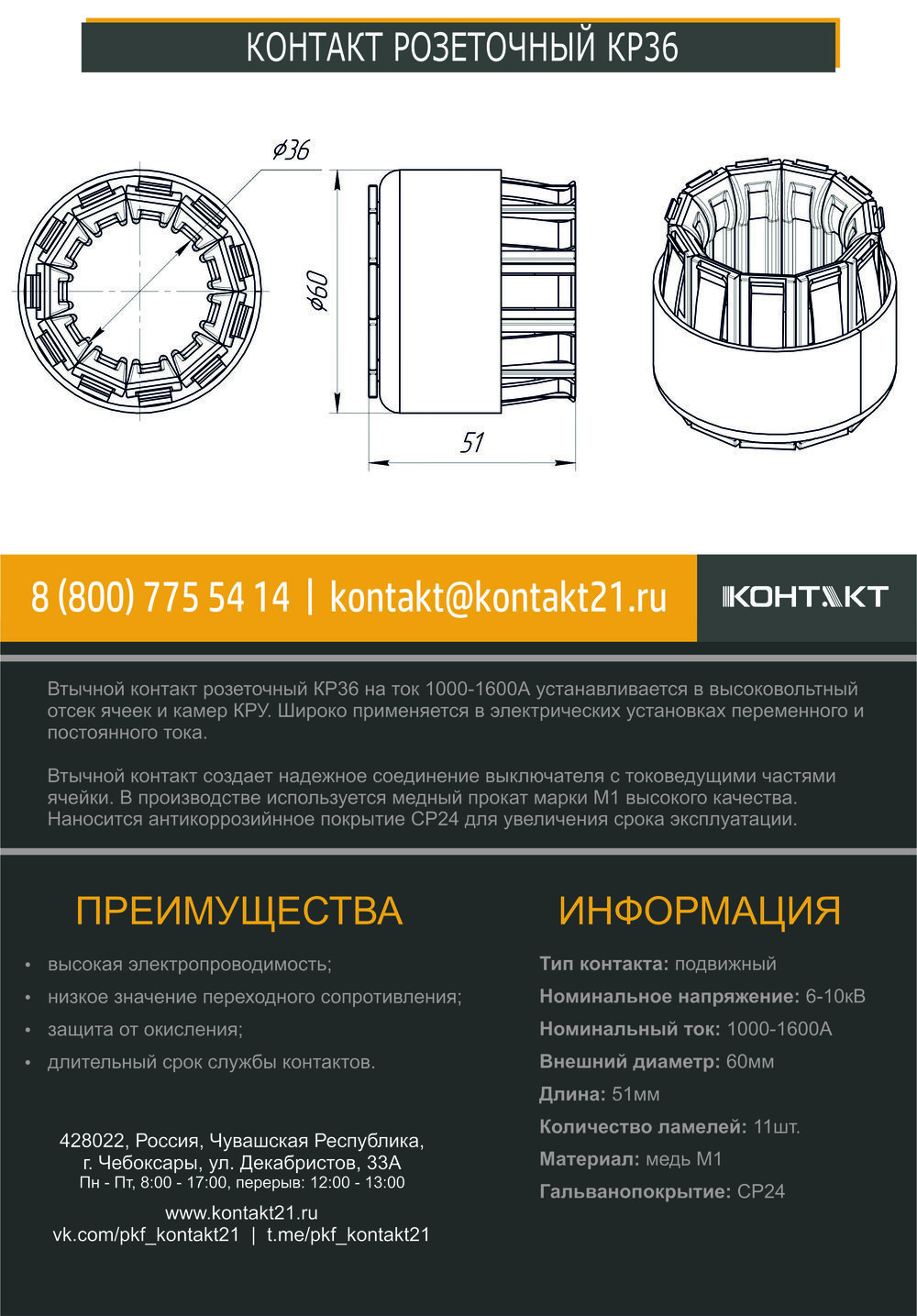 Втычной контакт розеточный КР36 на ток 1000-1600А устанавливается в высоковольтный отсек ячеек и камер КРУ. Широко применяется в электрических установках переменного и постоянного тока.