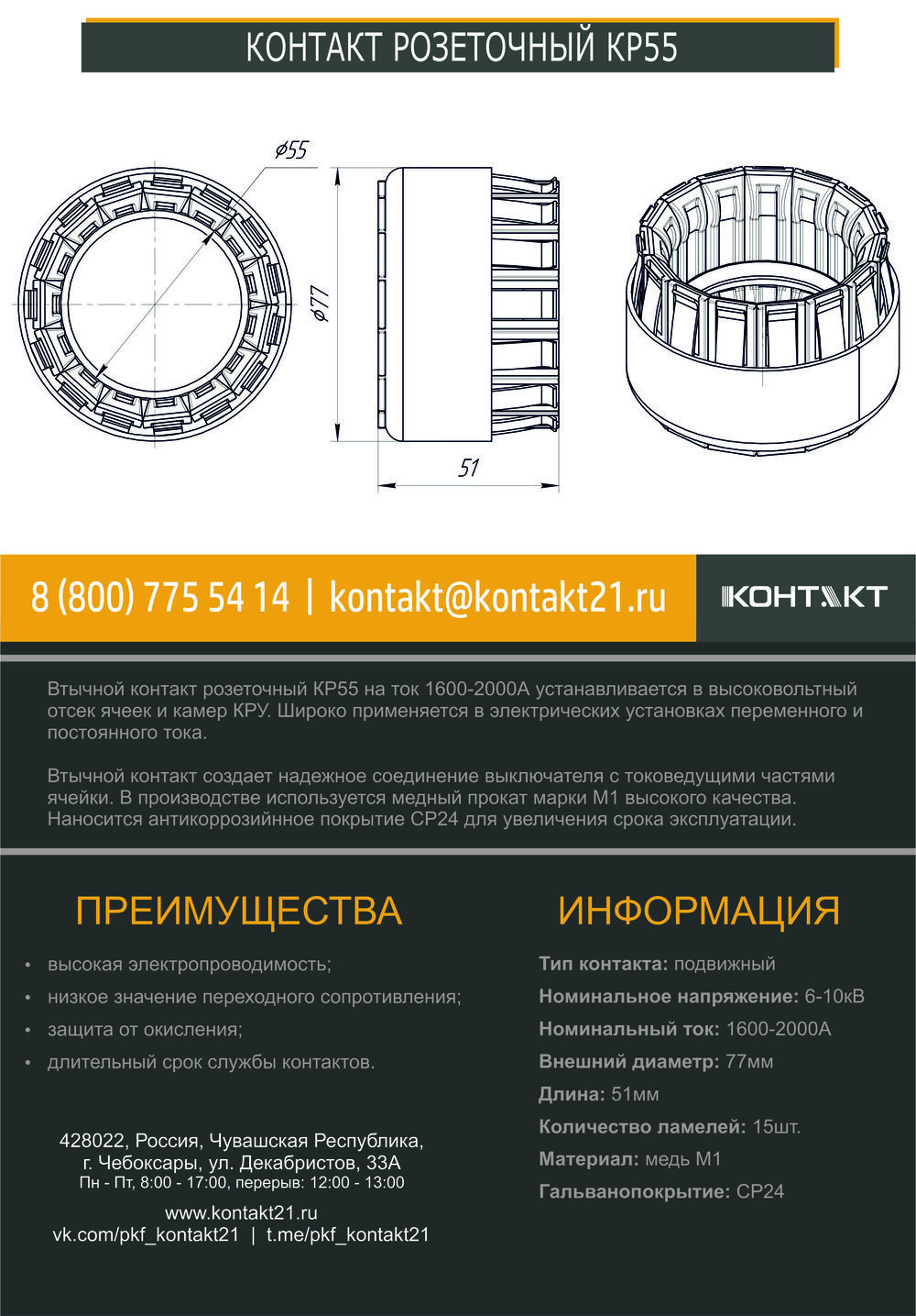 Втычной контакт розеточный КР55 на ток 1600-2000А устанавливается в высоковольтный отсек ячеек и камер КРУ. Широко применяется в электрических установках переменного и постоянного тока.
