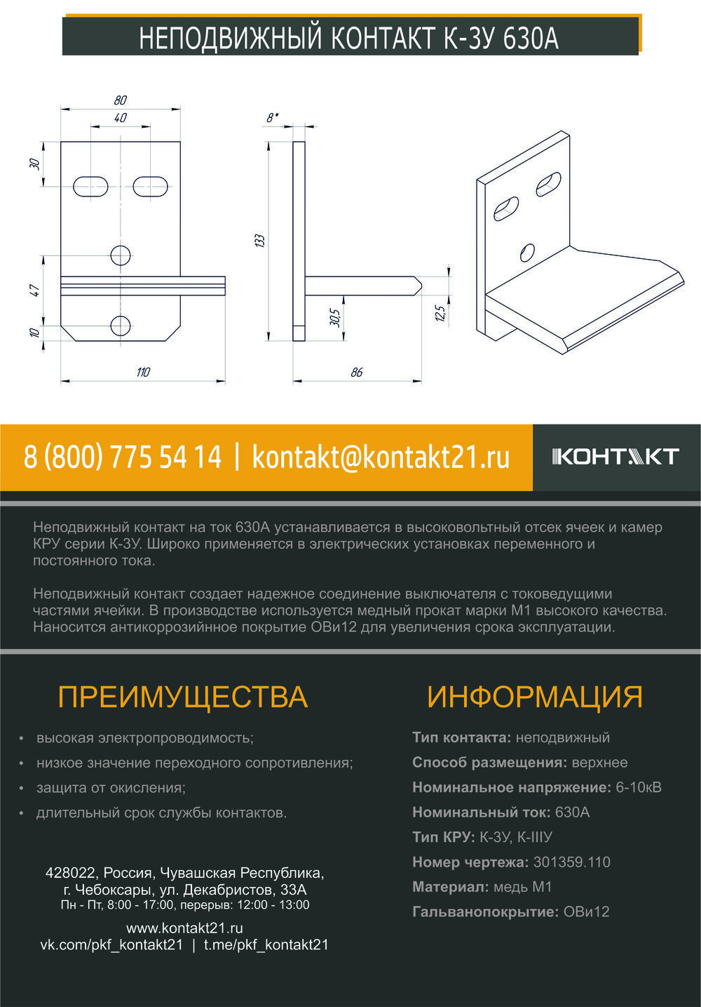 Неподвижный контакт на ток 630А устанавливается в высоковольтный отсек ячеек и камер КРУ серии К-3У. Широко применяется в электрических установках переменного и постоянного тока.