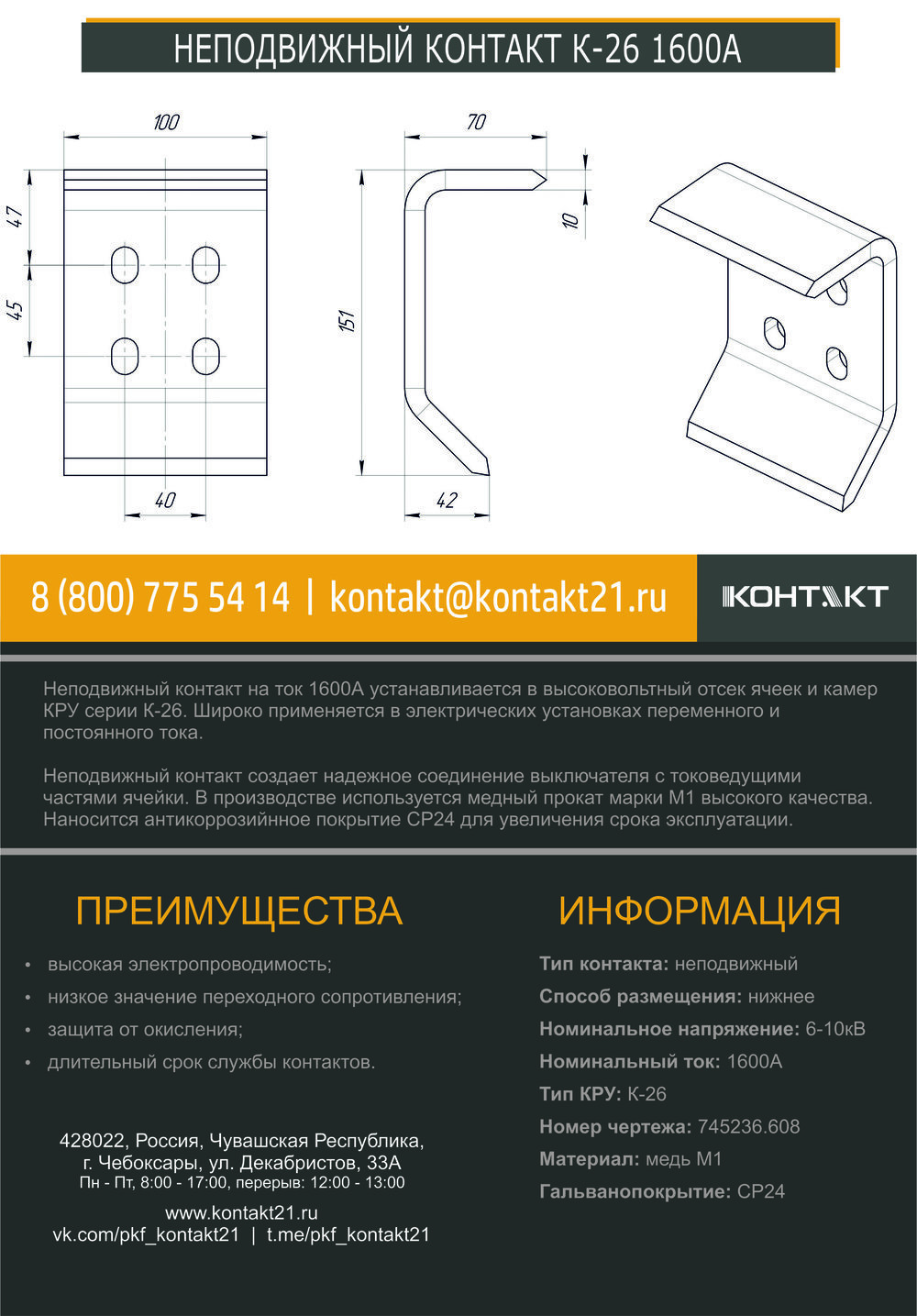 Неподвижный контакт на ток 1600А устанавливается в высоковольтный отсек ячеек и камер КРУ серии К-26. Широко применяется в электрических установках переменного и постоянного тока.