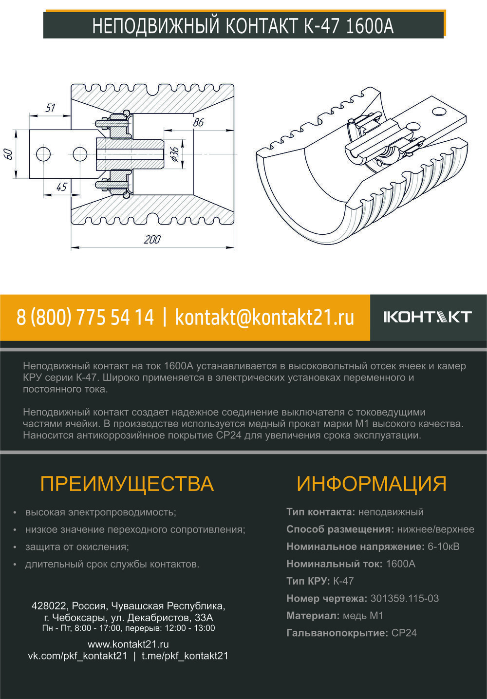 Неподвижный контакт на ток 1600А устанавливается в высоковольтный отсек ячеек и камер КРУ серии К-47. Широко применяется в электрических установках переменного и постоянного тока.