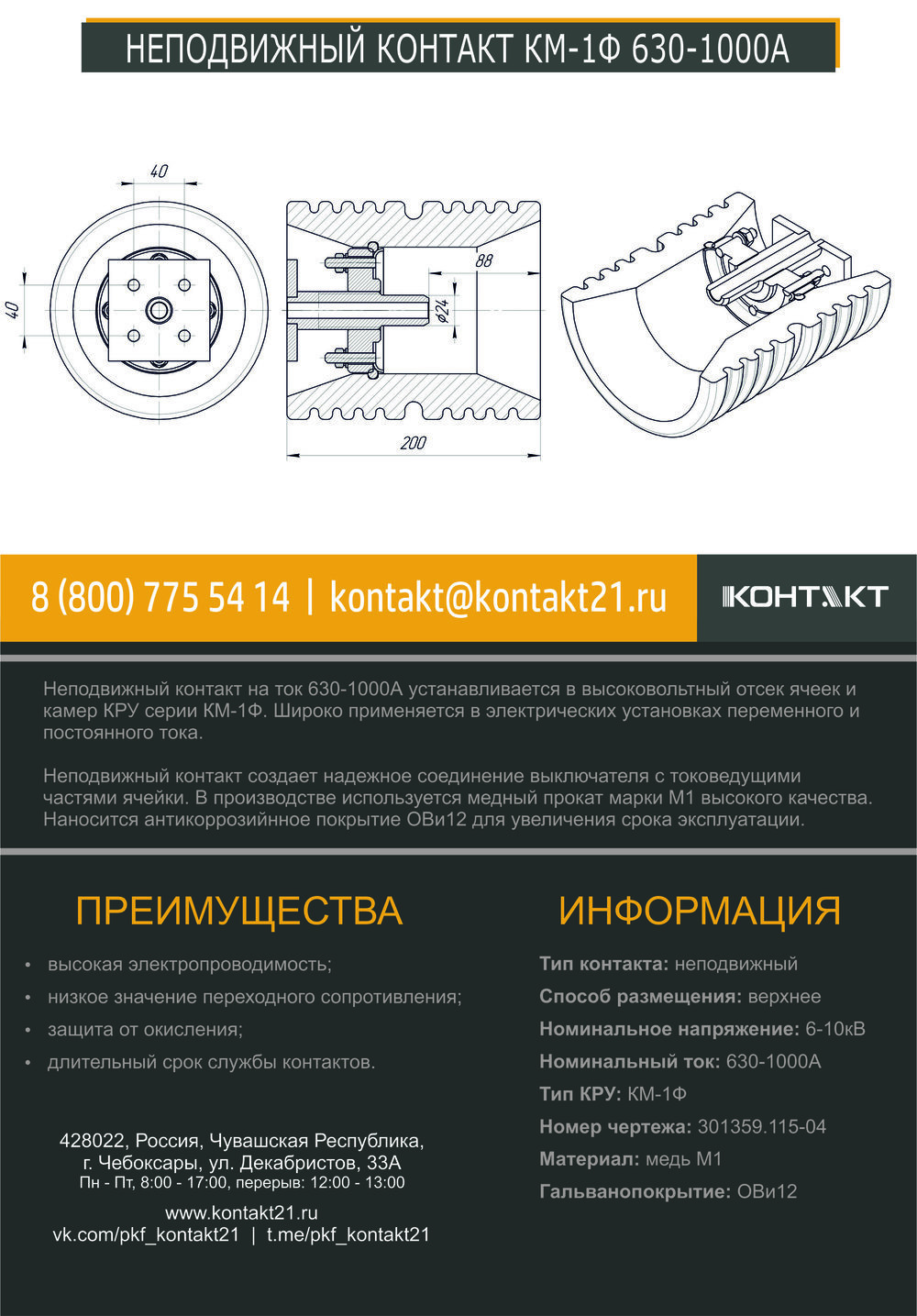 Неподвижный контакт на ток 630-1000А устанавливается в высоковольтный отсек ячеек и камер КРУ серии КМ-1Ф. Широко применяется в электрических установках переменного и постоянного тока.