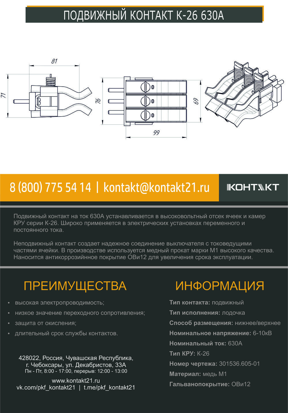 Подвижный контакт на ток 630А устанавливается в высоковольтный отсек ячеек и камер КРУ серии К-26. Широко применяется в электрических установках переменного и постоянного тока.