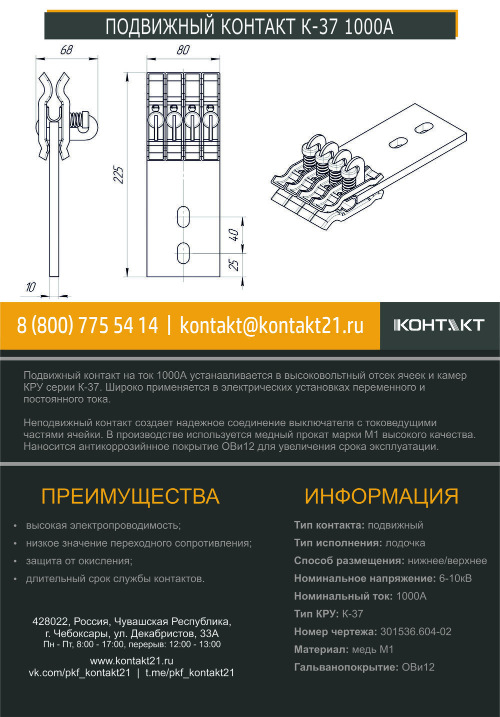 Подвижный контакт на ток 1000А устанавливается в высоковольтный отсек ячеек и камер КРУ серии К-37. Широко применяется в электрических установках переменного и постоянного тока.