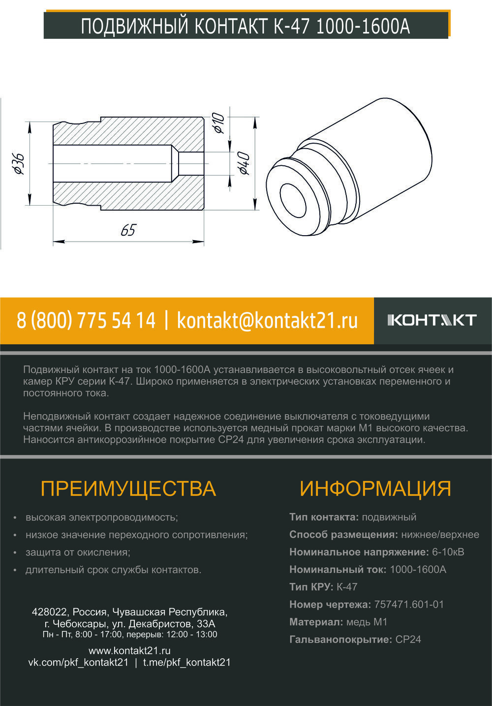 Подвижный контакт на ток 1000-1600А устанавливается в высоковольтный отсек ячеек и камер КРУ серии К-47. Широко применяется в электрических установках переменного и постоянного тока.