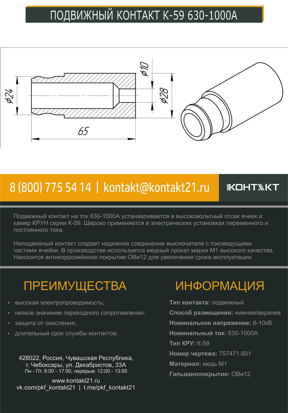 Подвижный контакт на ток 630-1000А устанавливается в высоковольтный отсек ячеек и камер КРУН серии К-59. Широко применяется в электрических установках переменного и постоянного тока.