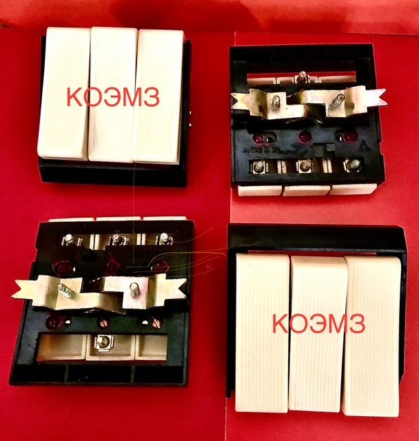 КОЭМЗ продает новые с хранения: Выключатели 3-х клавишные скрытой установки. Ток: 250В 50Гц. 6А ХЛ4. Сделано в СССР.