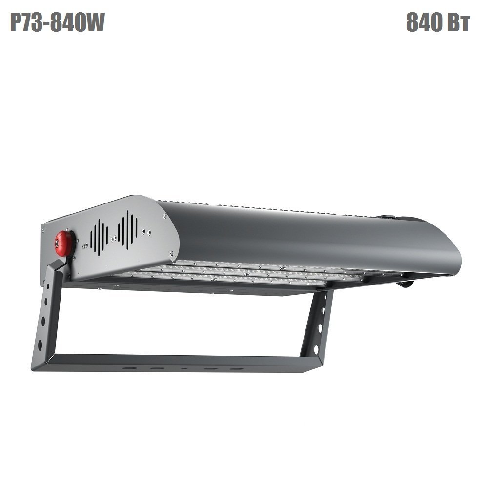 P73-840W. Мачтовый светодиодный прожектор, мощностью 840 Вт. По световому потоку близок к металлогалогенным прожекторам 1500 Вт. Устанавливается на любую поверхность с помощью поворотной скобы, применяется как для внутреннего, так и для наружного освещения. Основное применение - освещение футбольных полей и арен, аэропортов, открытых больших территорий.