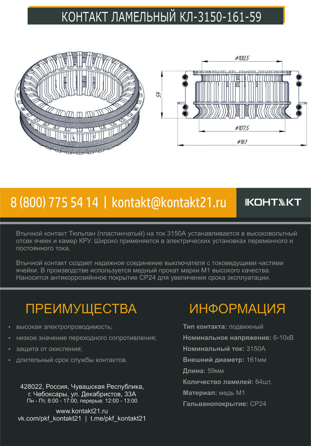 Втычной контакт Тюльпан (пластинчатый) на ток 3150А устанавливается в высоковольтный отсек ячеек и камер КРУ. Широко применяется в электрических установках переменного и постоянного тока.