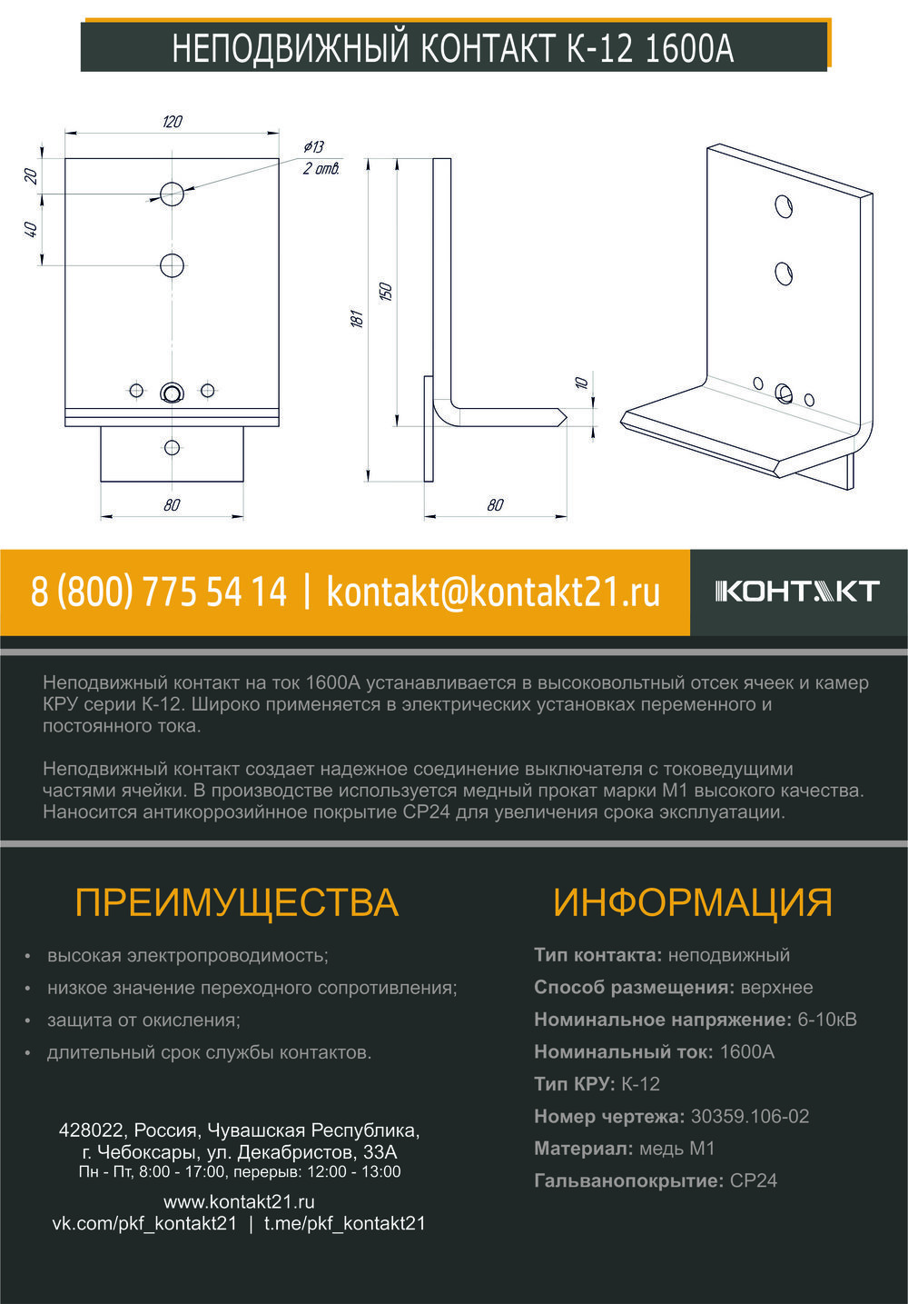 Неподвижный контакт на ток 1600А устанавливается в высоковольтный отсек ячеек и камер КРУ серии К-12. Широко применяется в электрических установках переменного и постоянного тока.