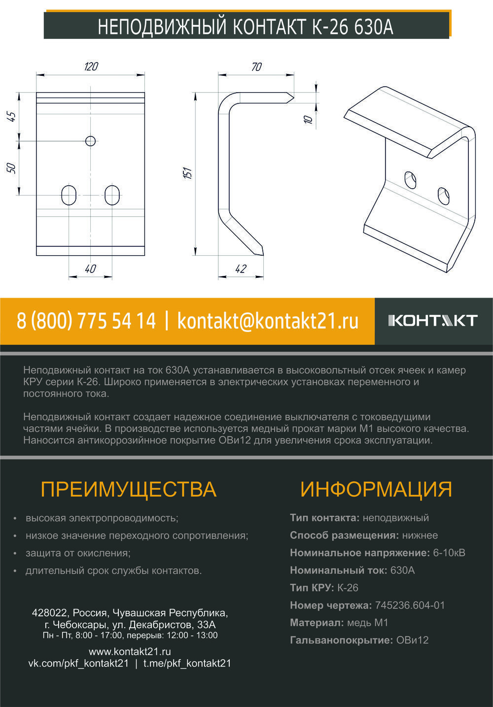 Неподвижный контакт на ток 630А устанавливается в высоковольтный отсек ячеек и камер КРУ серии К-26. Широко применяется в электрических установках переменного и постоянного тока.