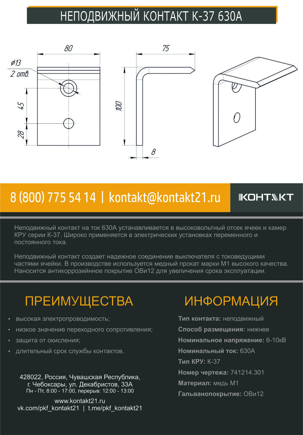 Неподвижный контакт на ток 630А устанавливается в высоковольтный отсек ячеек и камер КРУ серии К-37. Широко применяется в электрических установках переменного и постоянного тока.