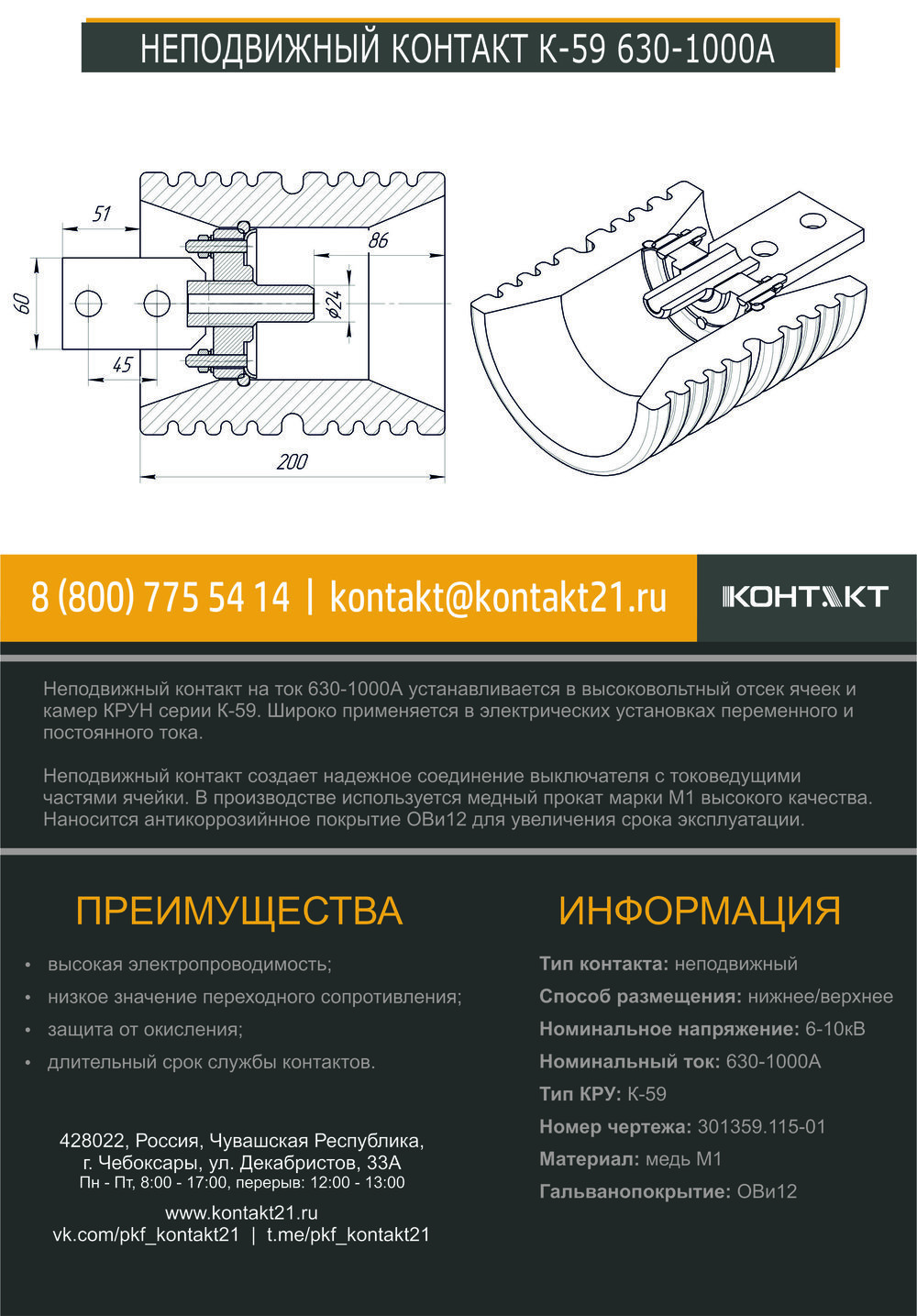 Неподвижный контакт на ток 630-1000А устанавливается в высоковольтный отсек ячеек и камер КРУН серии К-59. Широко применяется в электрических установках переменного и постоянного тока.