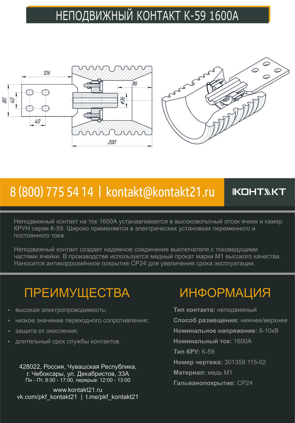 Неподвижный контакт на ток 1600А устанавливается в высоковольтный отсек ячеек и камер КРУН серии К-59. Широко применяется в электрических установках переменного и постоянного тока.