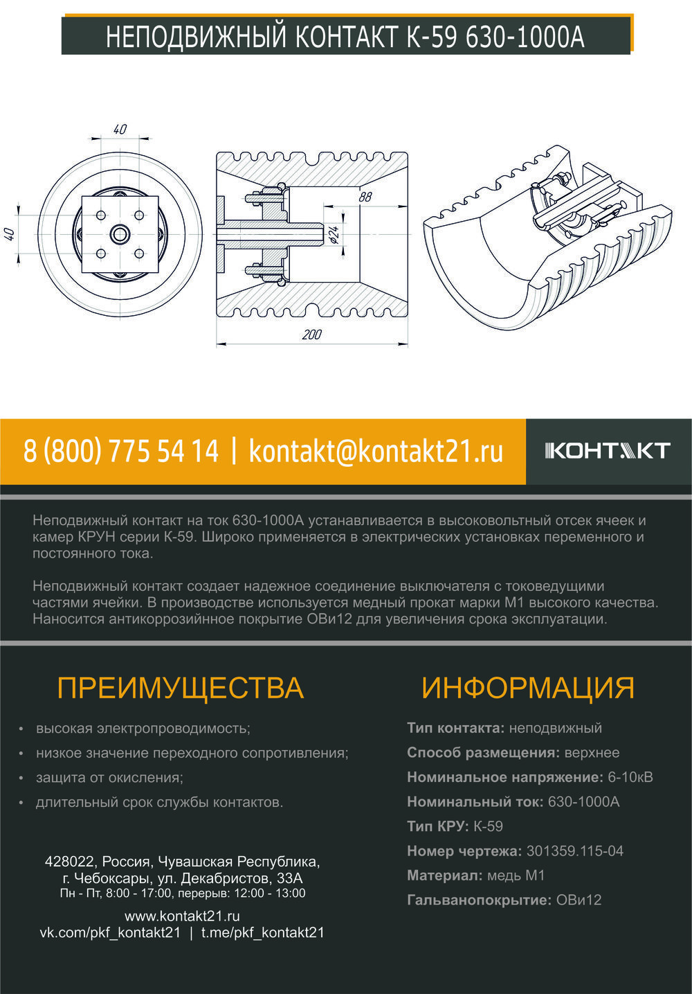 Неподвижный контакт на ток 630-1000А устанавливается в высоковольтный отсек ячеек и камер КРУН серии К-59. Широко применяется в электрических установках переменного и постоянного тока.
