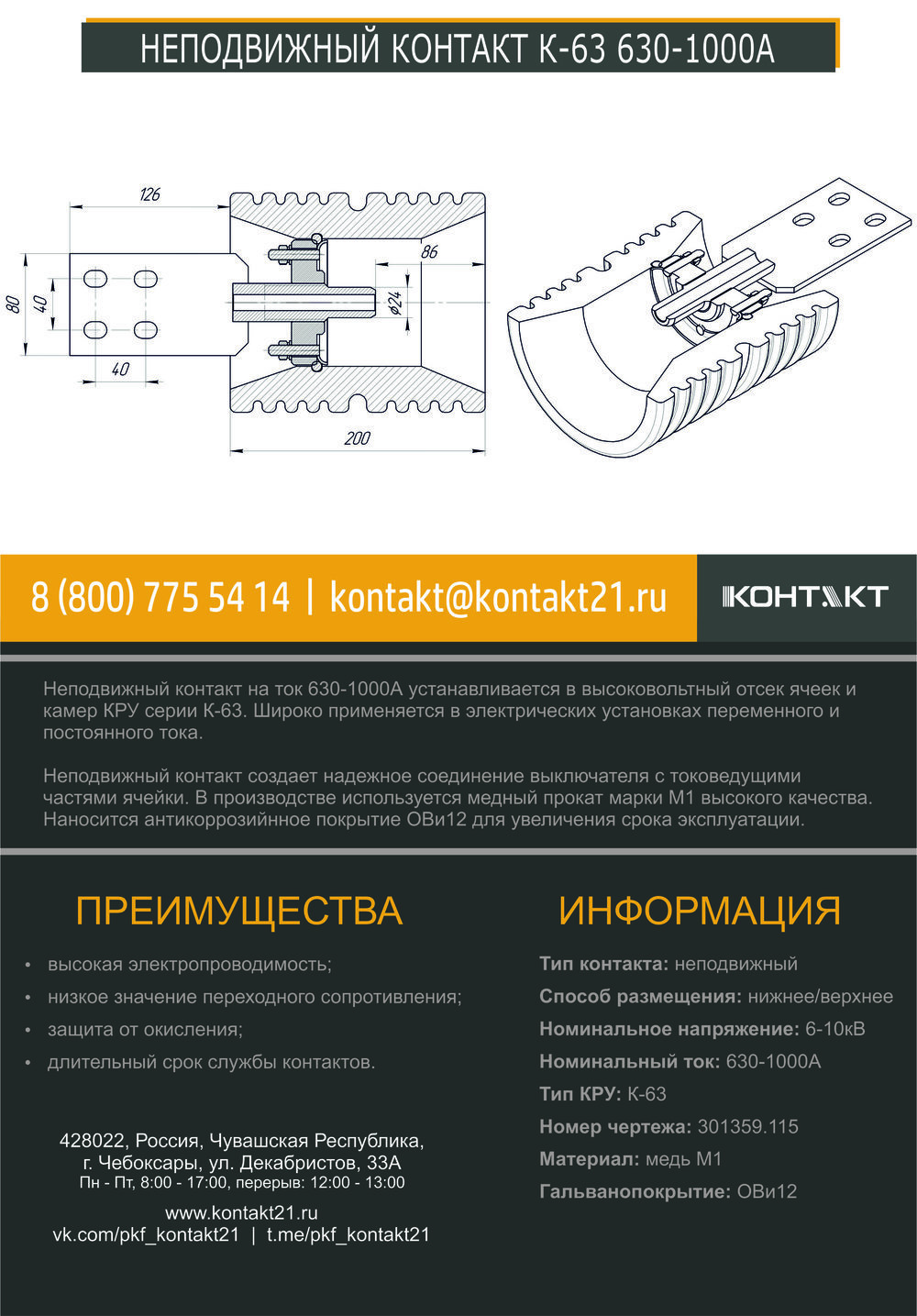 Неподвижный контакт на ток 630-1000А устанавливается в высоковольтный отсек ячеек и камер КРУ серии К-63. Широко применяется в электрических установках переменного и постоянного тока.