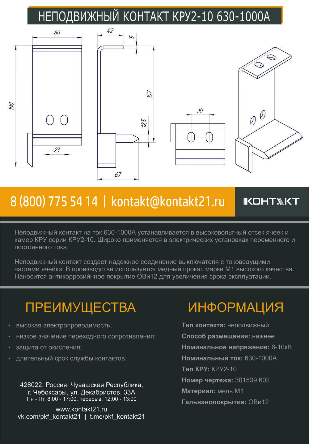 Неподвижный контакт на ток 630-1000А устанавливается в высоковольтный отсек ячеек и камер КРУ серии КРУ2-10. Широко применяется в электрических установках переменного и постоянного тока.