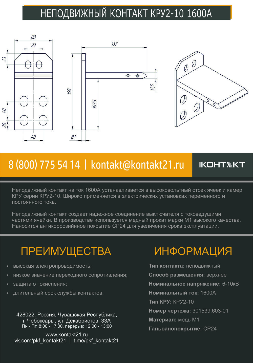 Неподвижный контакт на ток 1600А устанавливается в высоковольтный отсек ячеек и камер КРУ серии КРУ2-10. Широко применяется в электрических установках переменного и постоянного тока.