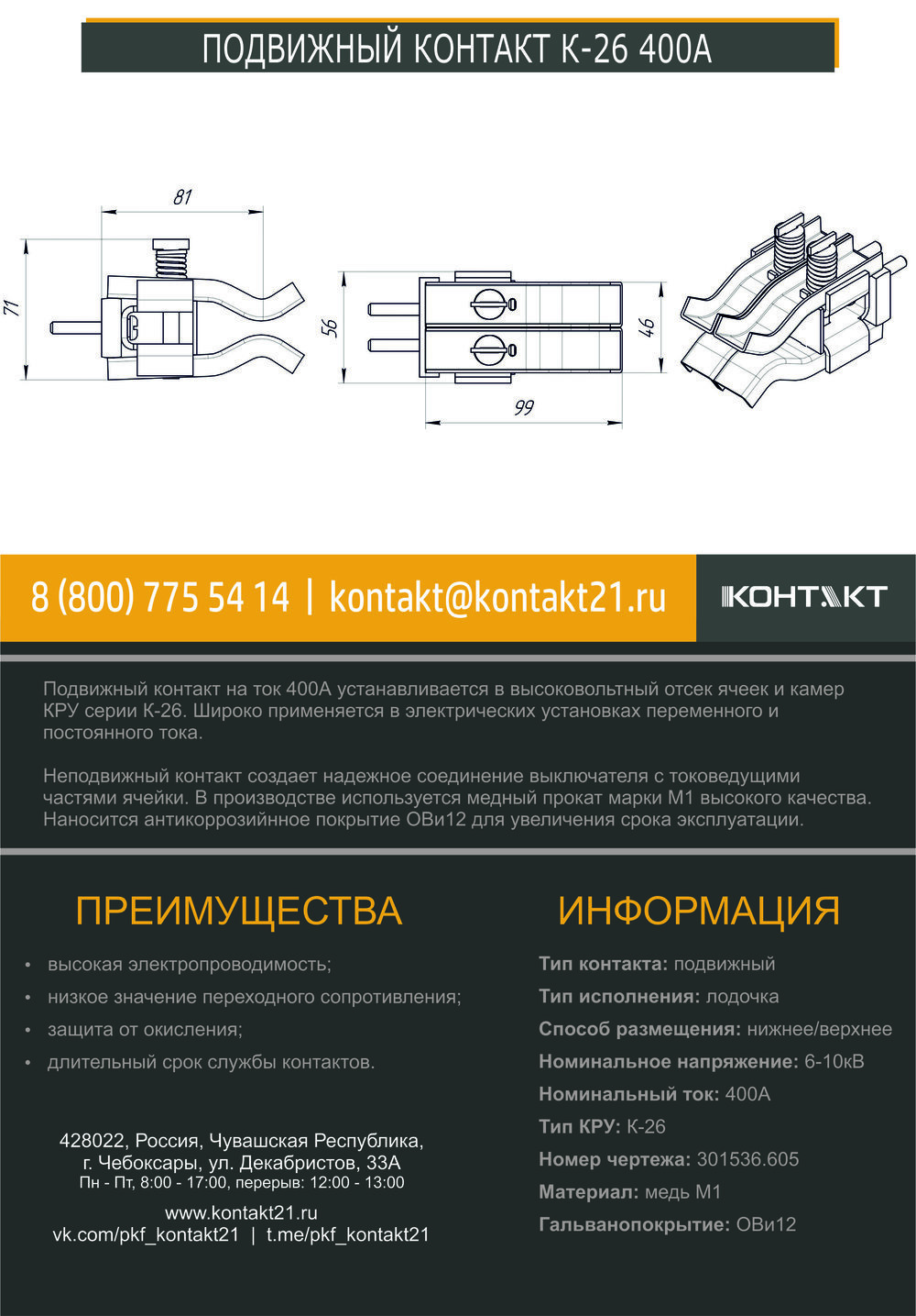 Подвижный контакт на ток 400А устанавливается в высоковольтный отсек ячеек и камер КРУ серии К-26. Широко применяется в электрических установках переменного и постоянного тока.