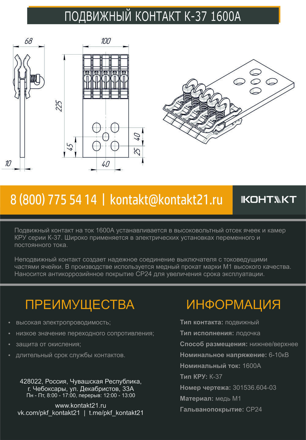 Подвижный контакт на ток 1600А устанавливается в высоковольтный отсек ячеек и камер КРУ серии К-37. Широко применяется в электрических установках переменного и постоянного тока.