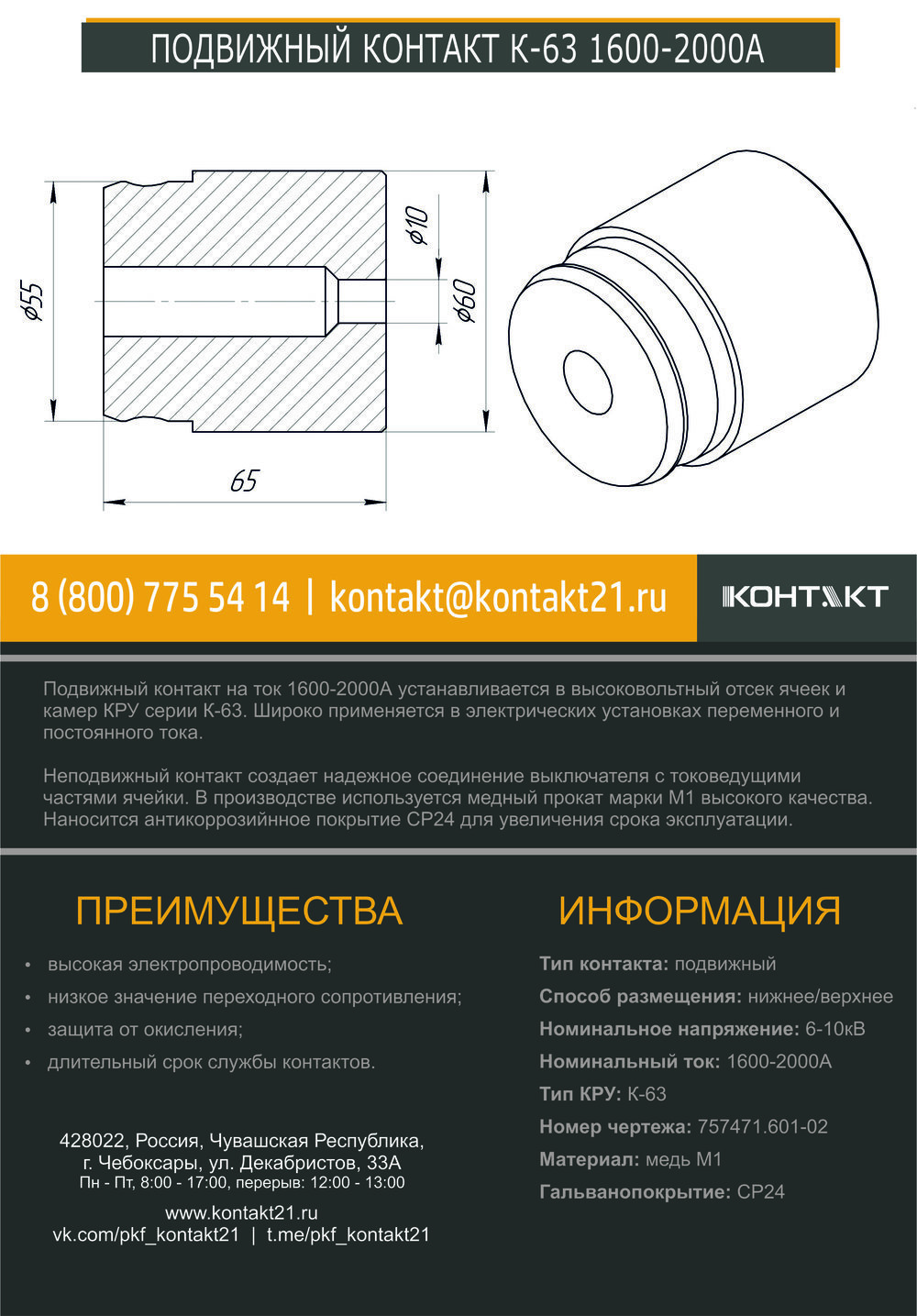 Подвижный контакт на ток 1600-2000А устанавливается в высоковольтный отсек ячеек и камер КРУ серии К-63. Широко применяется в электрических установках переменного и постоянного тока.
