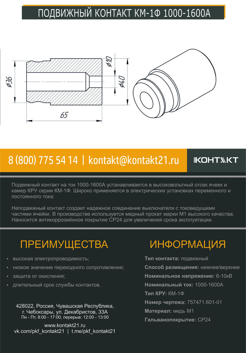 Подвижный контакт на ток 1000-1600А устанавливается в высоковольтный отсек ячеек и камер КРУ серии КМ-1Ф. Широко применяется в электрических установках переменного и постоянного тока.