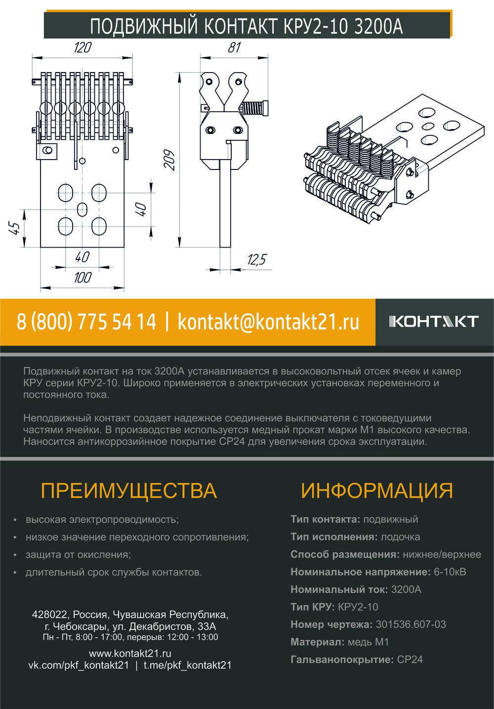 Подвижный контакт на ток 3200А устанавливается в высоковольтный отсек ячеек и камер КРУ серии КРУ2-10. Широко применяется в электрических установках переменного и постоянного тока.